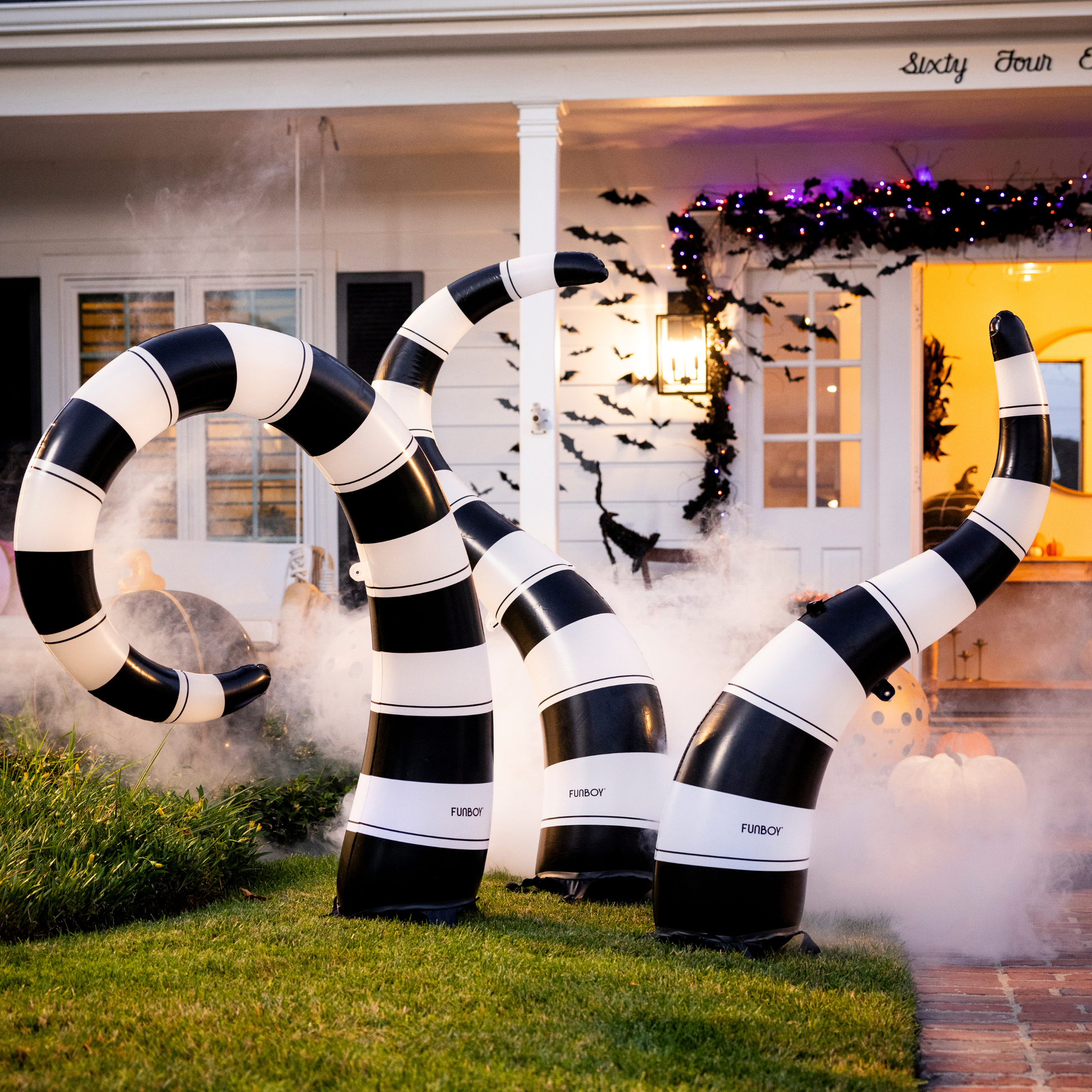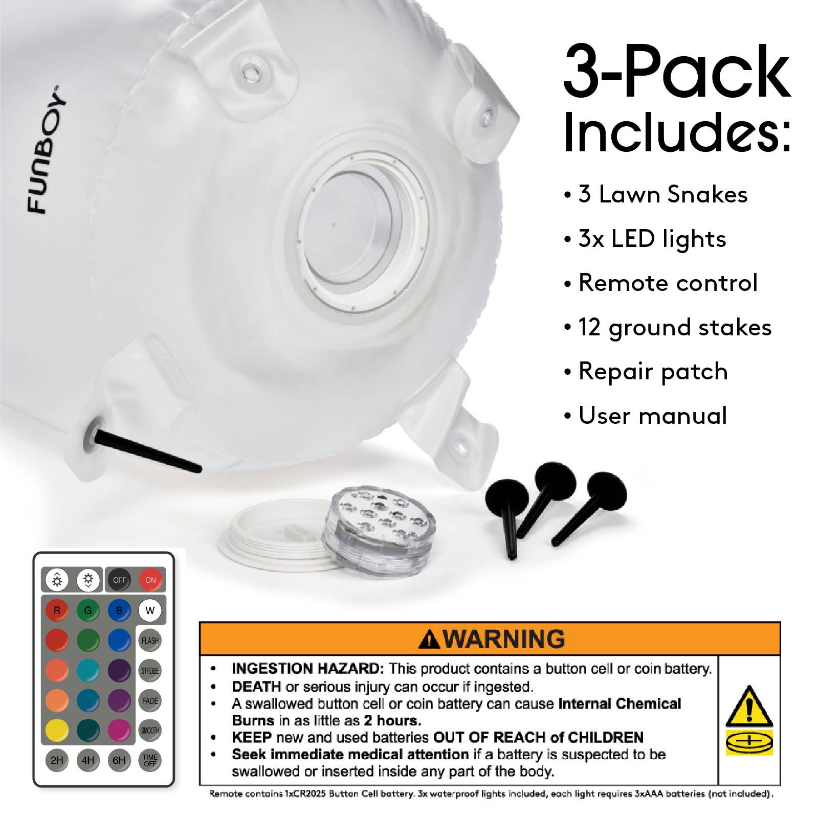 Creep it Real. Transform your lawn into a slithering spectacle with FUNBOY’s Light-Up Inflatable Yard Snakes. These black and white snakes emerge from the ground, casting a glow that changes colors with the click of a remote and the included bright battery operated LED lights. Each worm requires 3xAAA Batteries (not included). Securely staked, these Yard Snakes stay put and are built with durable material to last through the fall climate. No constant air, no cords, just inflate the best Halloween decorations around. Configure them in any way that enhances your spooky setup. Spook in style.