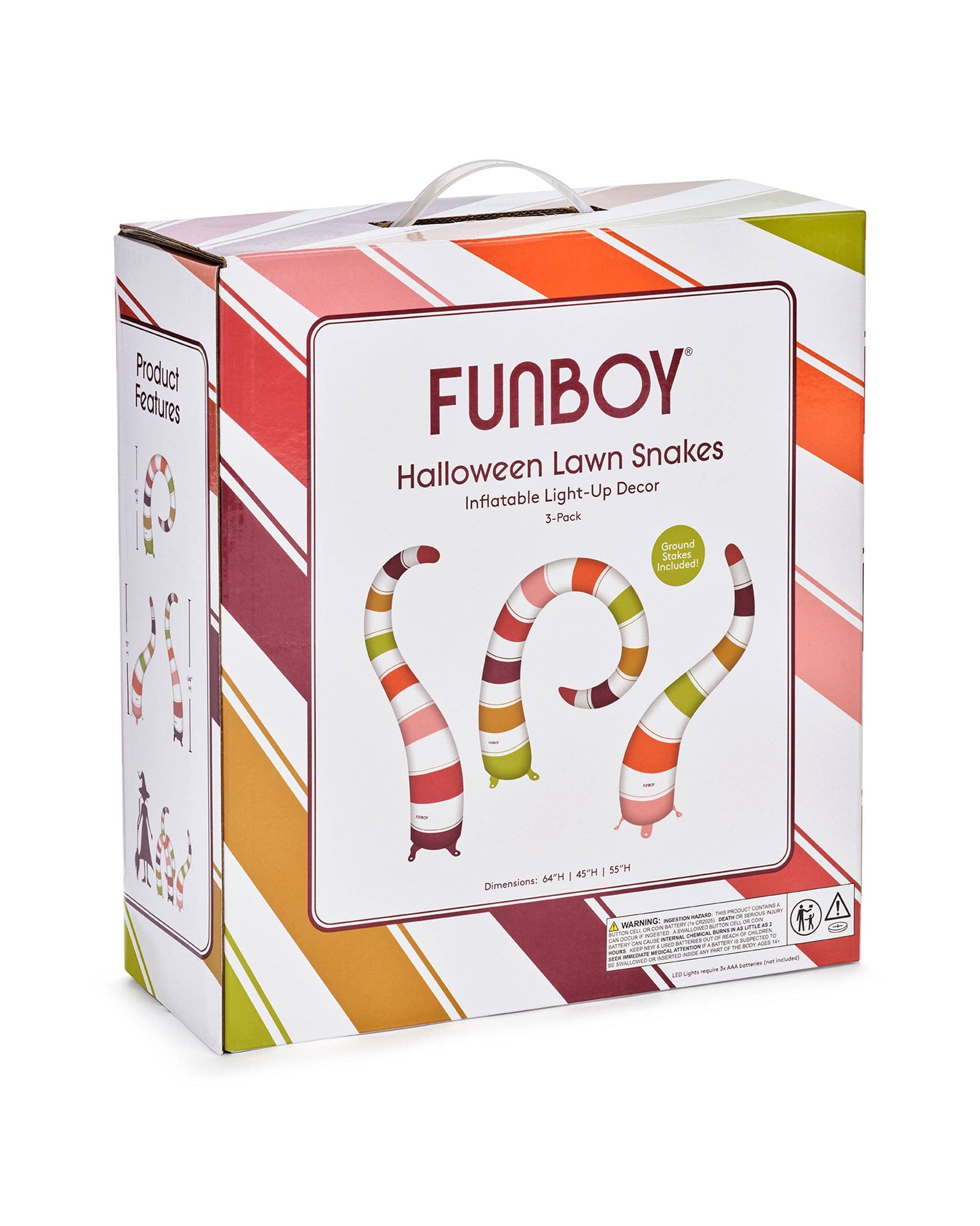 Creep it Real. Transform your lawn into a slithering spectacle with FUNBOY’s Light-Up Inflatable Yard Snakes. These colorfully striped snakes emerge from the ground, casting a glow that changes colors with the click of a remote and the included bright battery operated LED lights. Each worm requires 3xAAA Batteries (not included). Securely staked, these Yard Snakes stay put and are built with durable material to last through the fall climate. No constant air, no cords, just inflate the best Halloween decorations around. Configure them in any way that enhances your spooky setup. Spook in style.