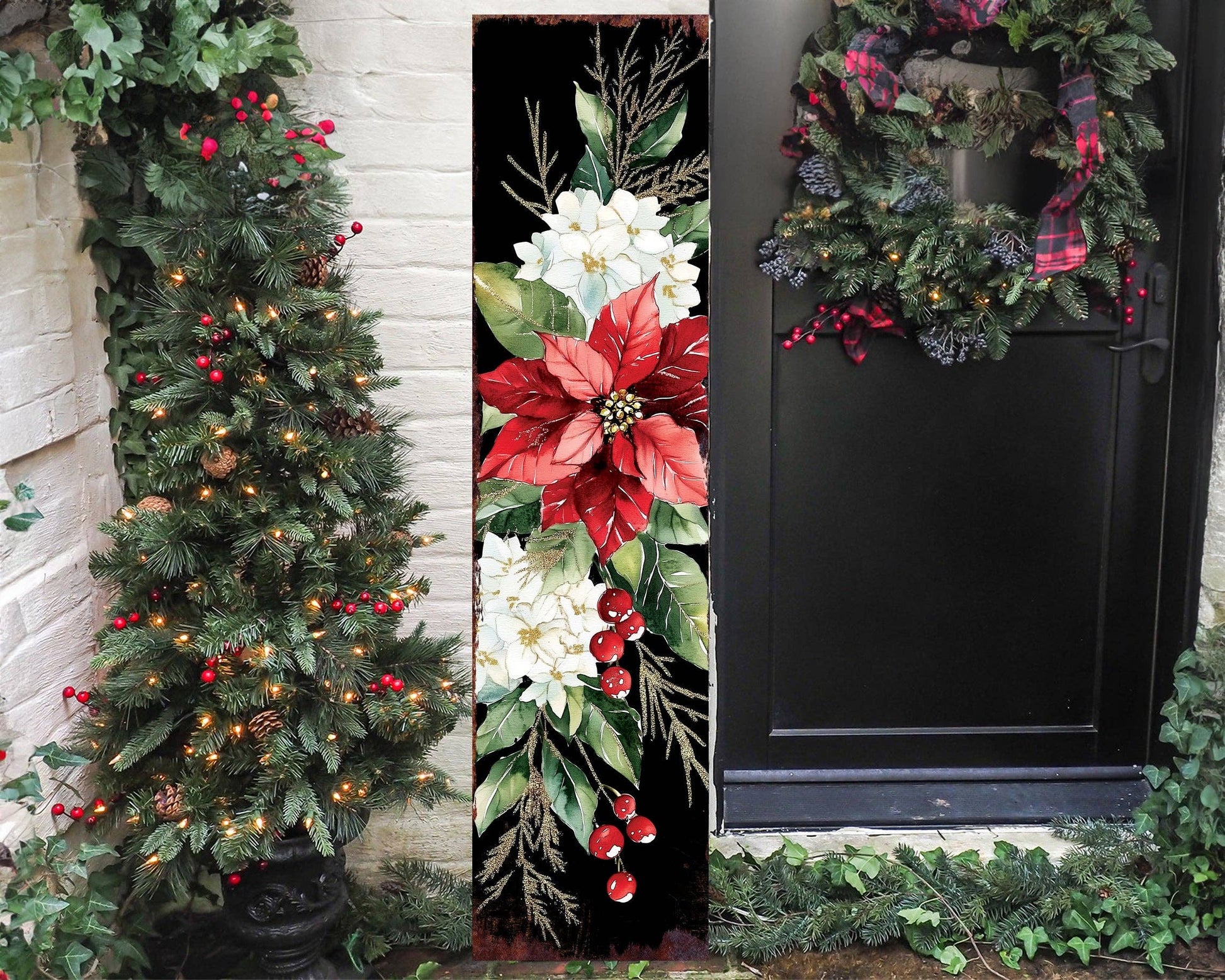Merry Christmas Poinsettia Vertical Porch Sign | Outdoor Holiday Decor